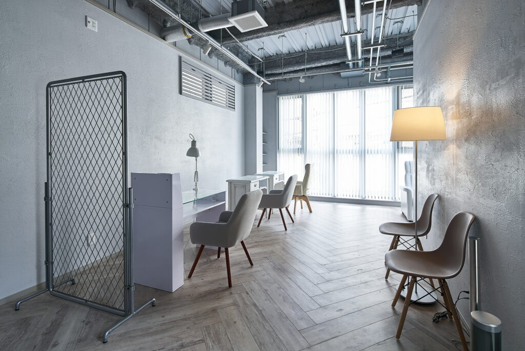 大きな連窓には縦型ブラインドを合わせて、自然光をやさしくコントロール。施術席ごとの明るさや動線も使いやすく調整しています。