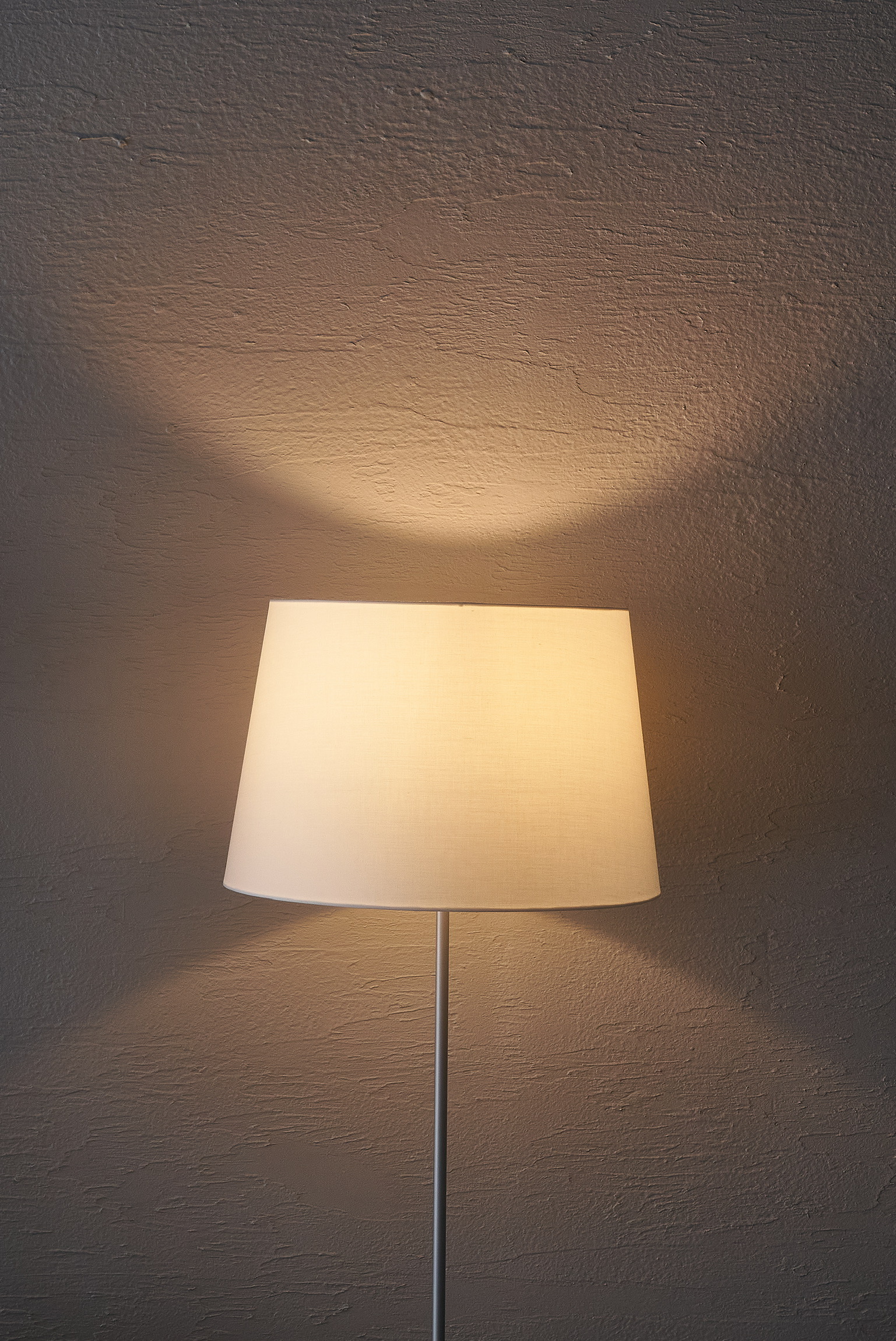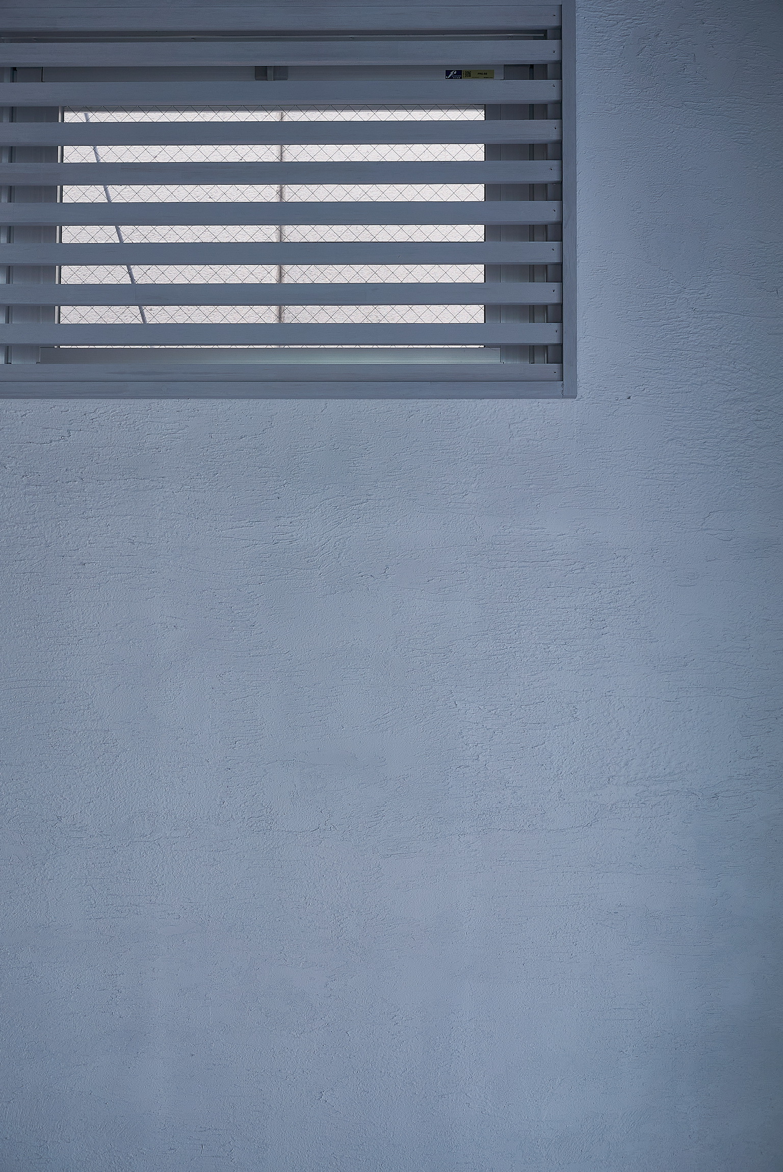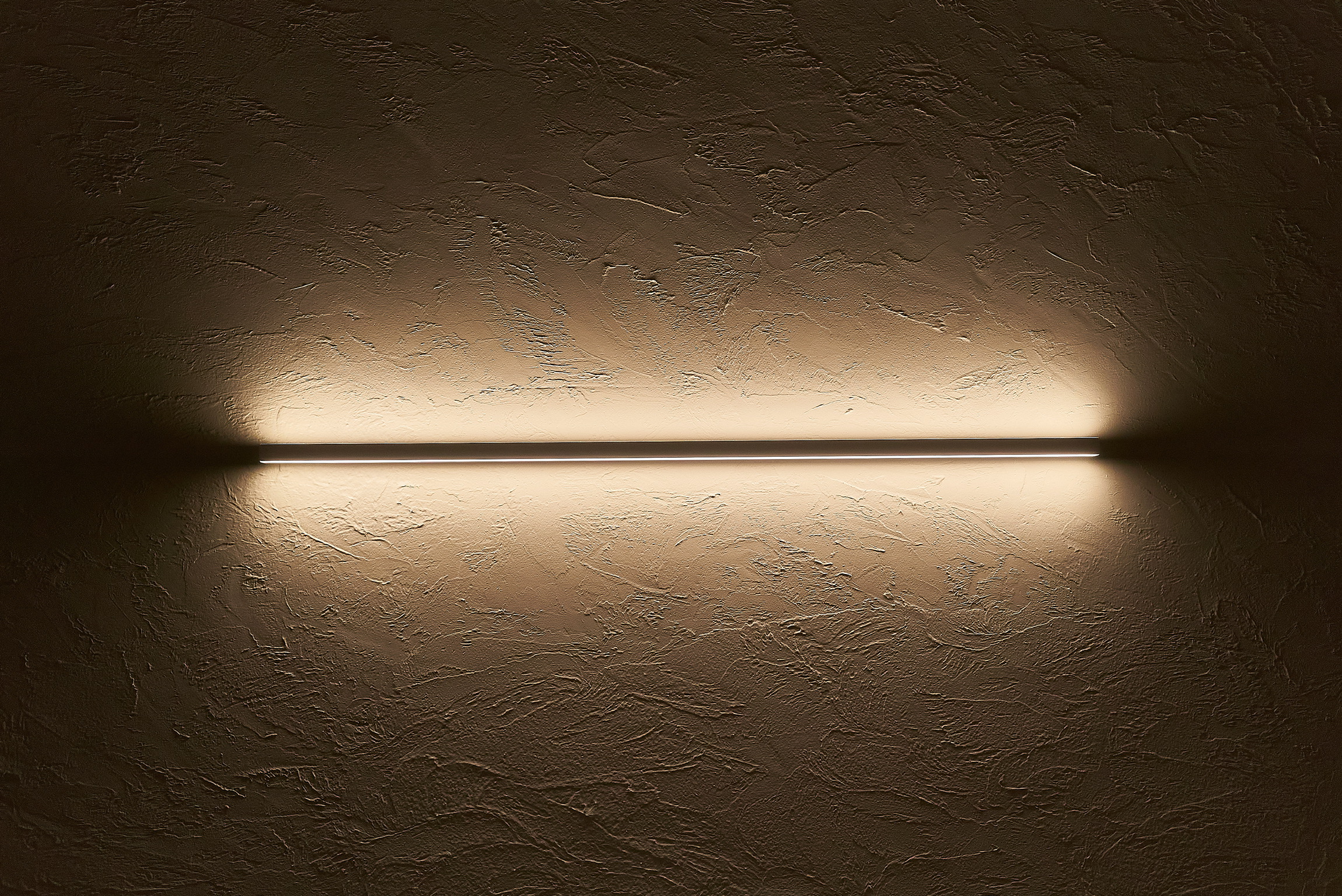 やわらかな光が縦型ブラインドを通ってゆっくり広がり、天井の配管やライティングレールまで美しく整います。