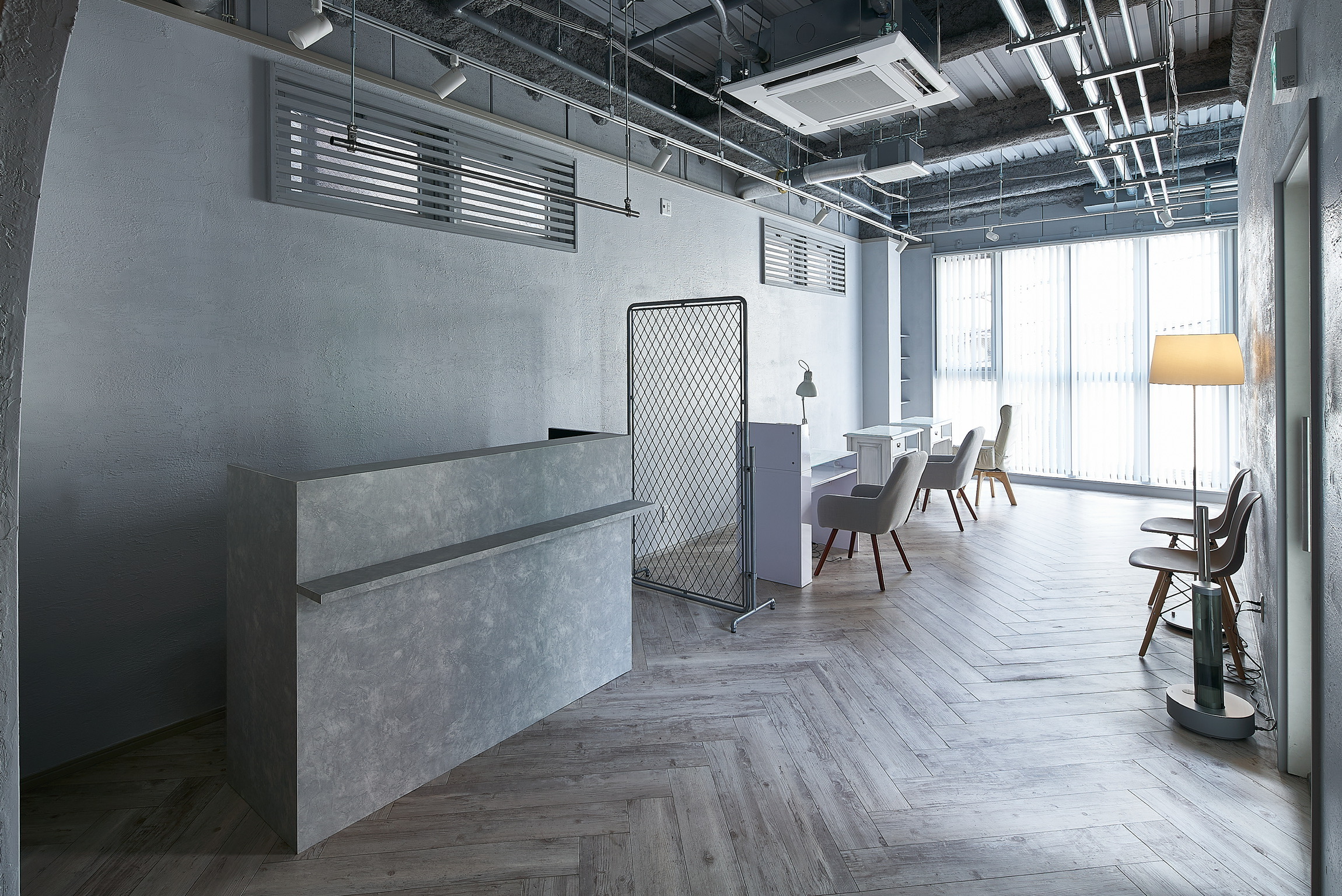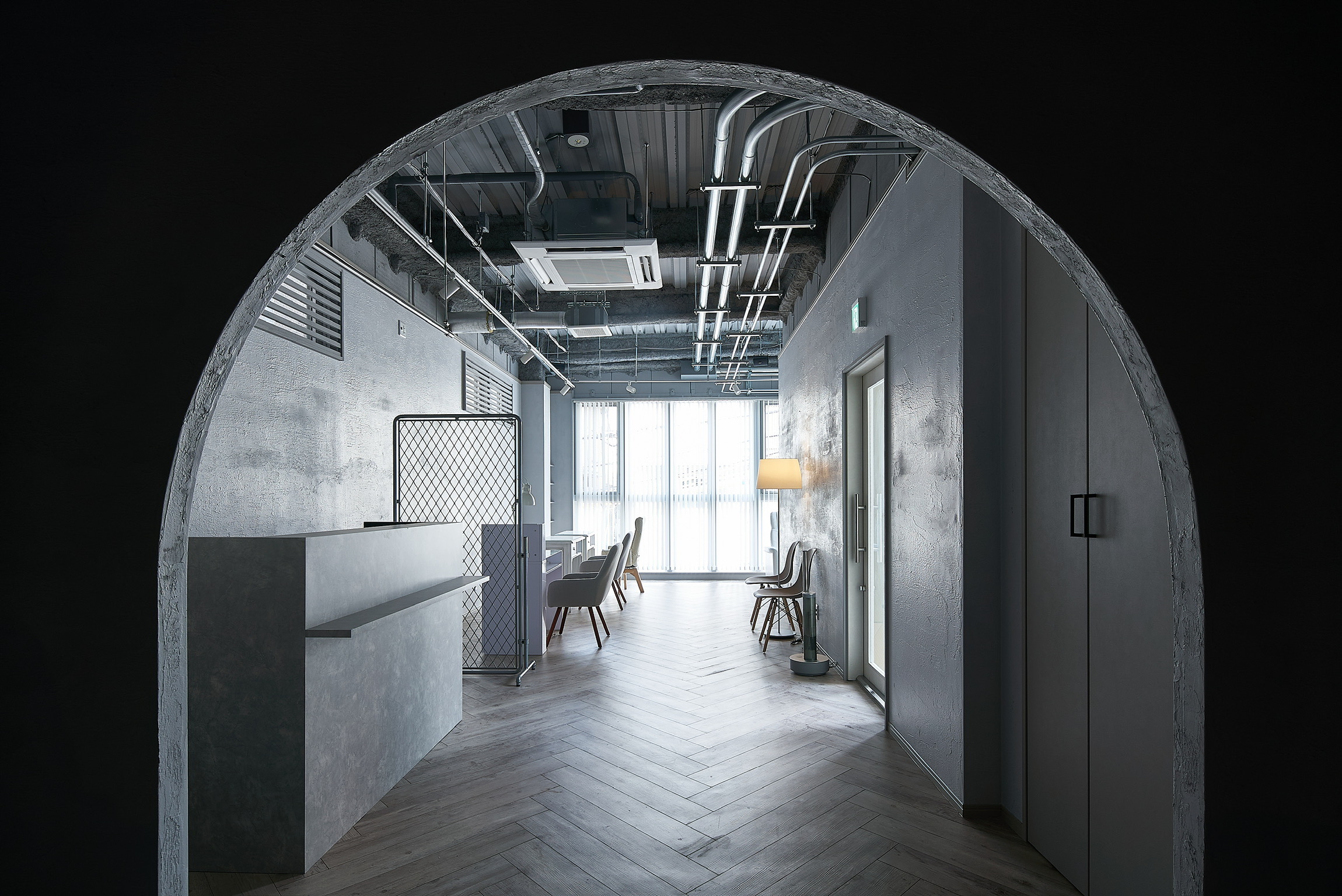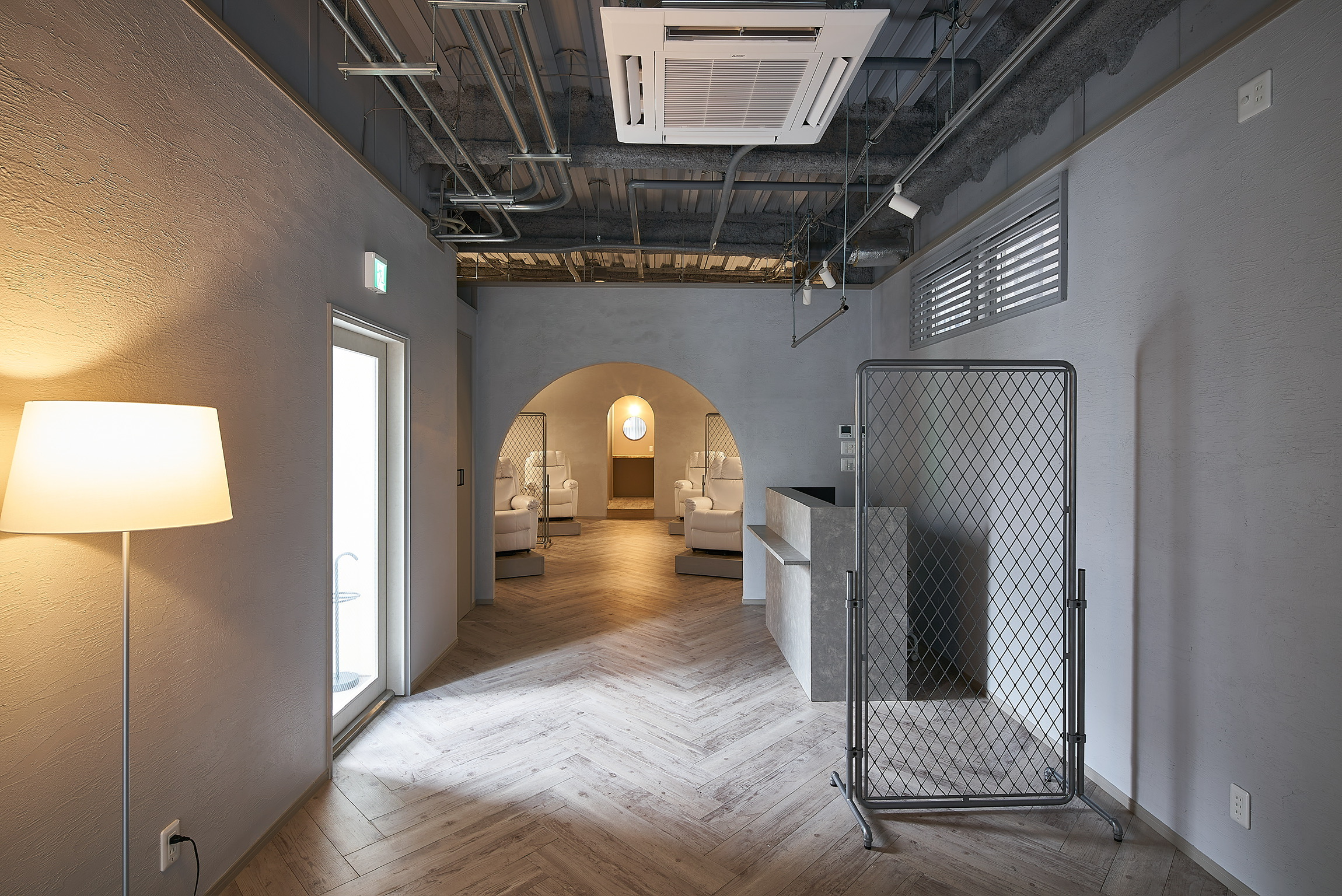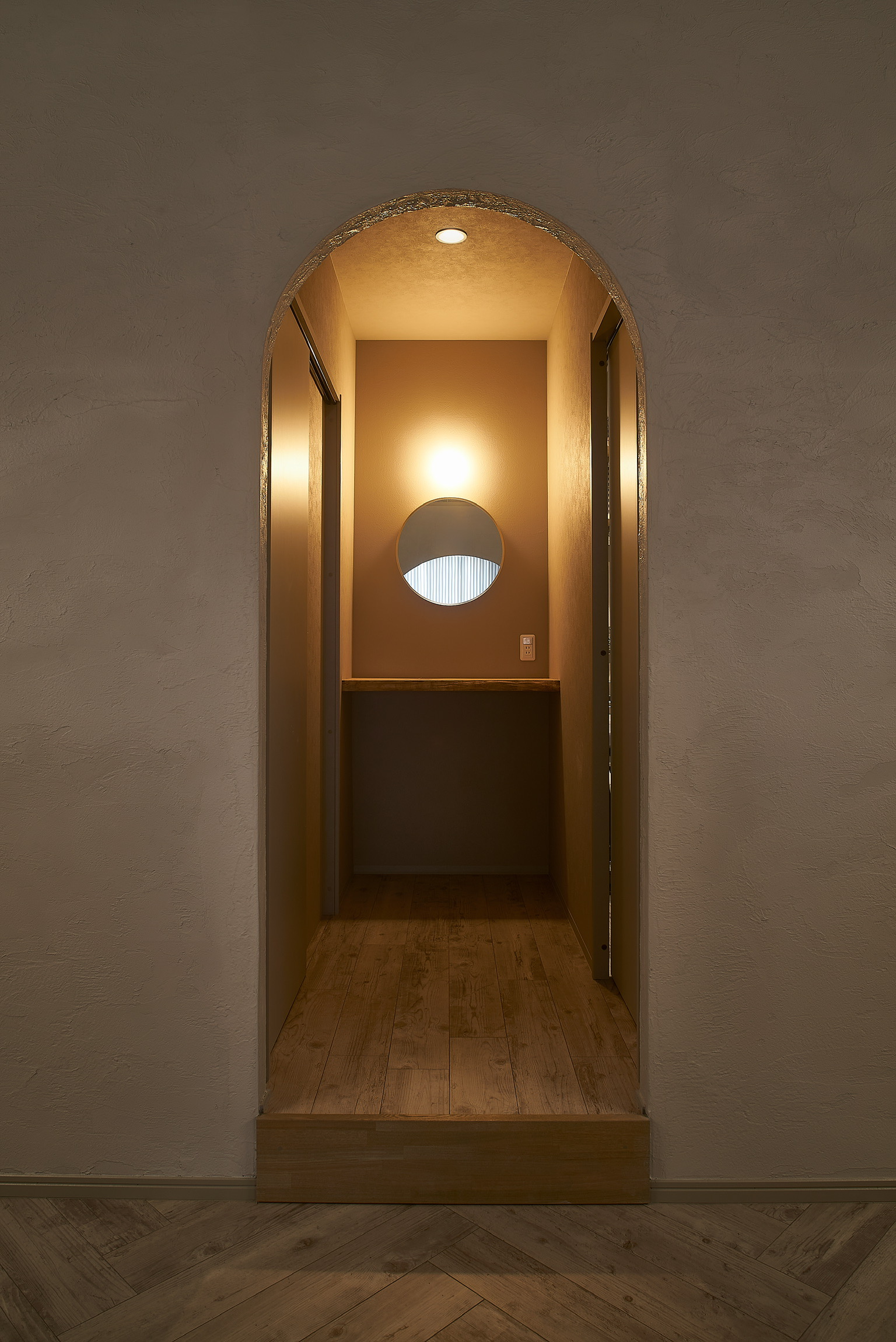 アーチをくぐると、特注グレーの漆喰壁と木目ヘリンボーンが迎えてくれる laula さんの空間。