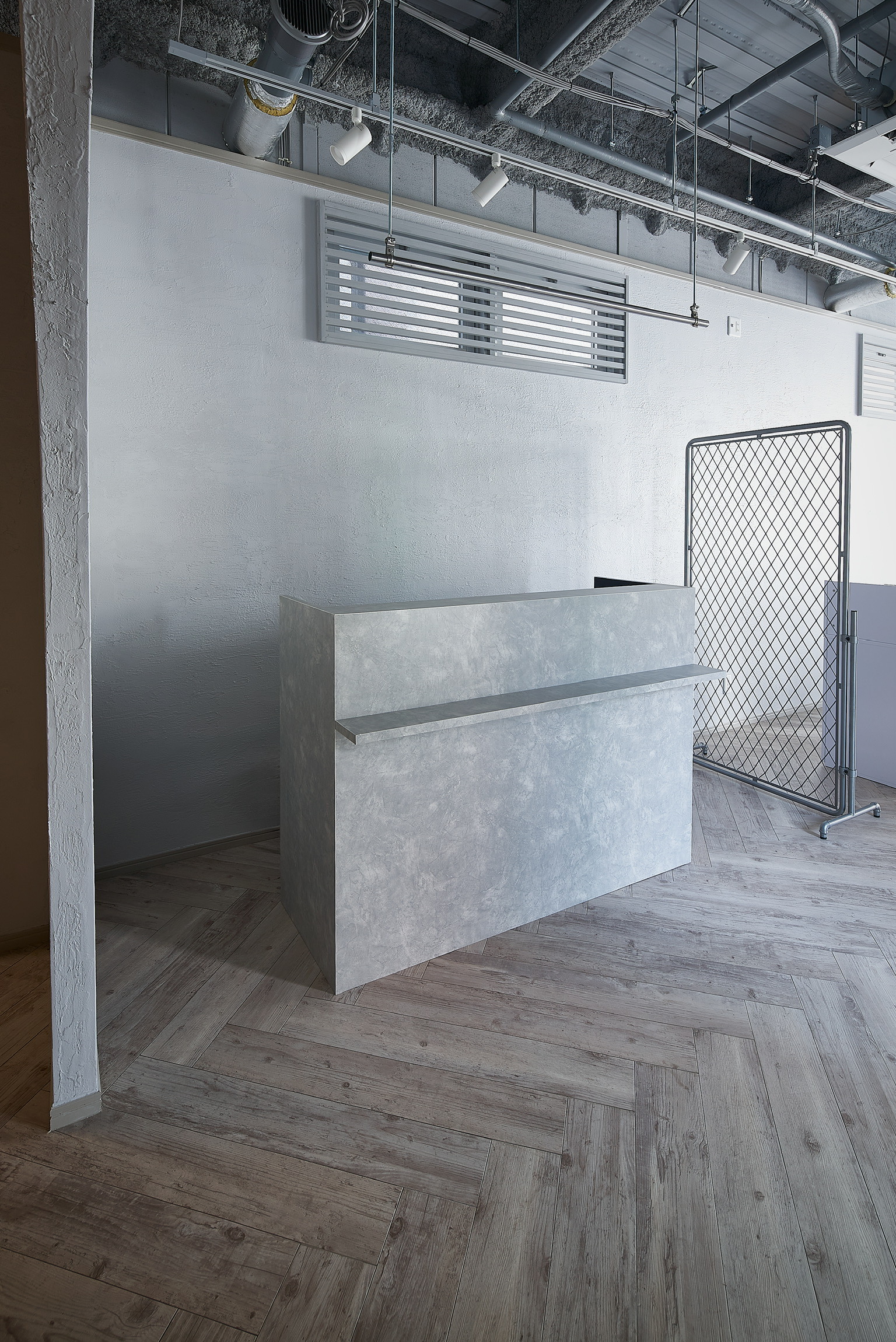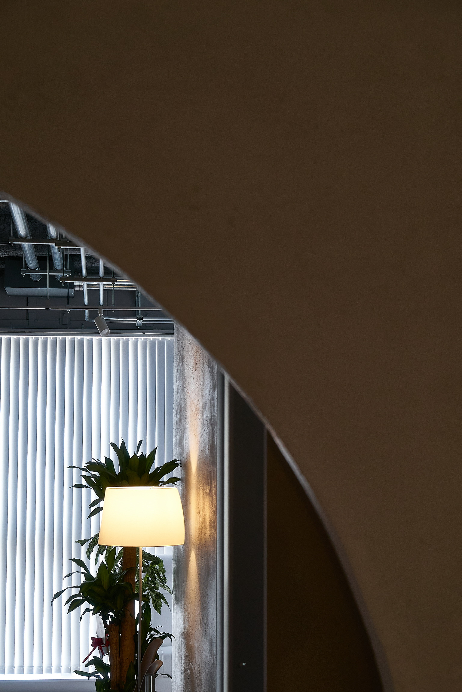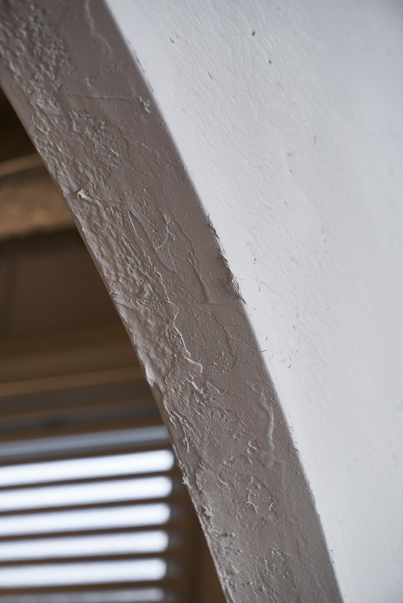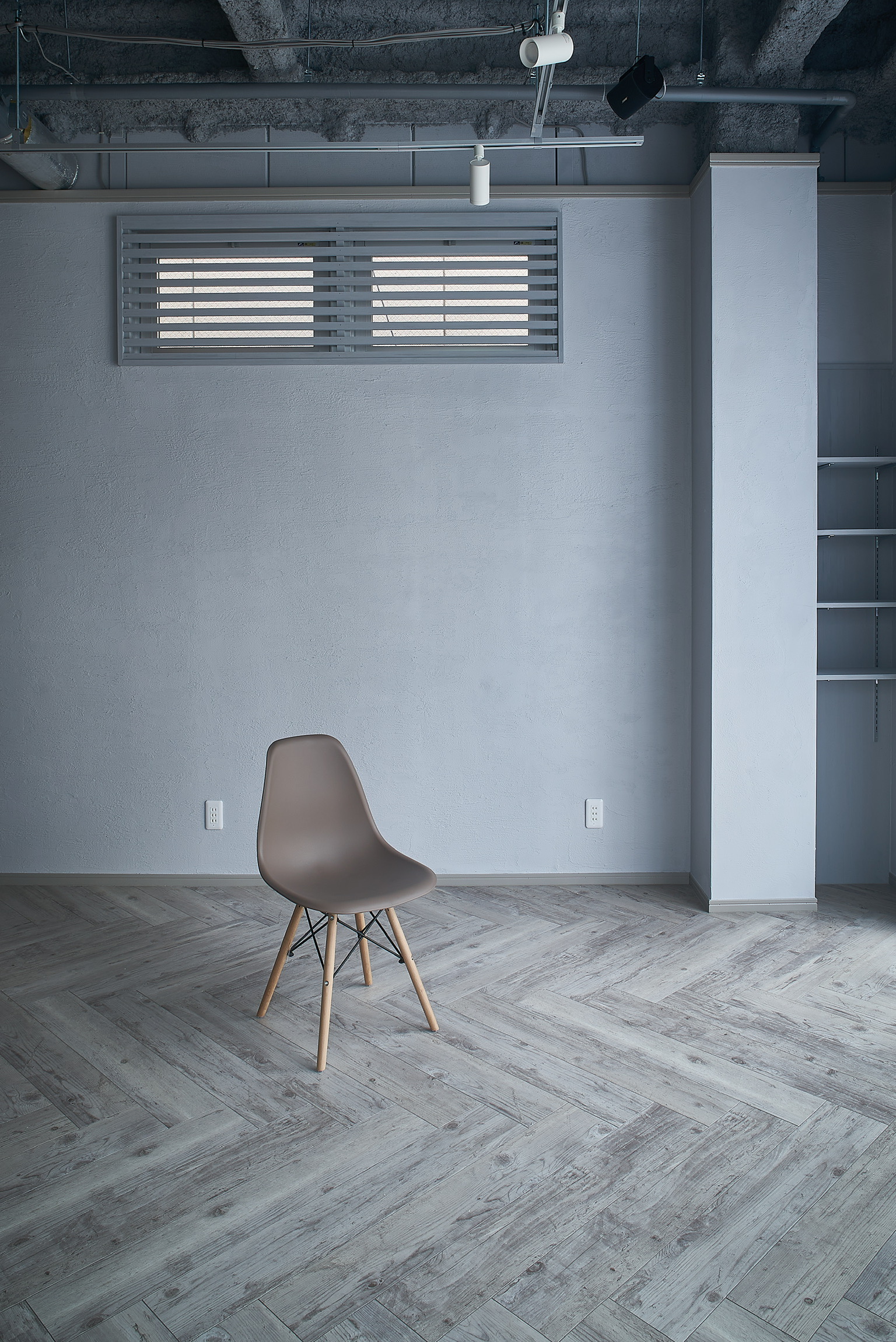 アーチをくぐると、特注グレーの漆喰壁と木目ヘリンボーンが迎えてくれる laula さんの空間。