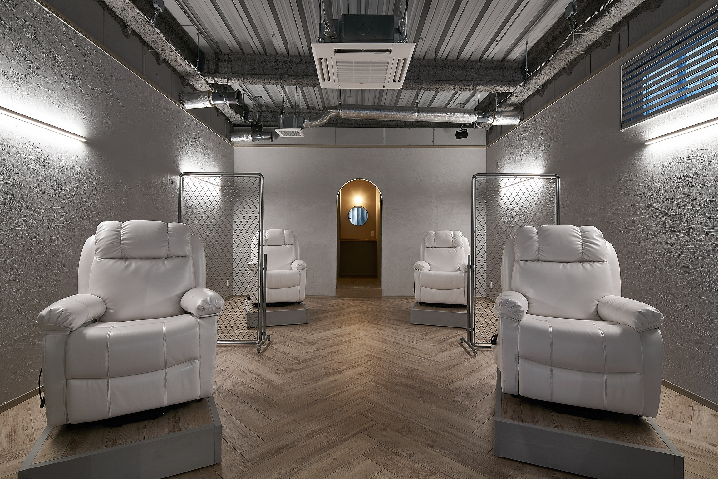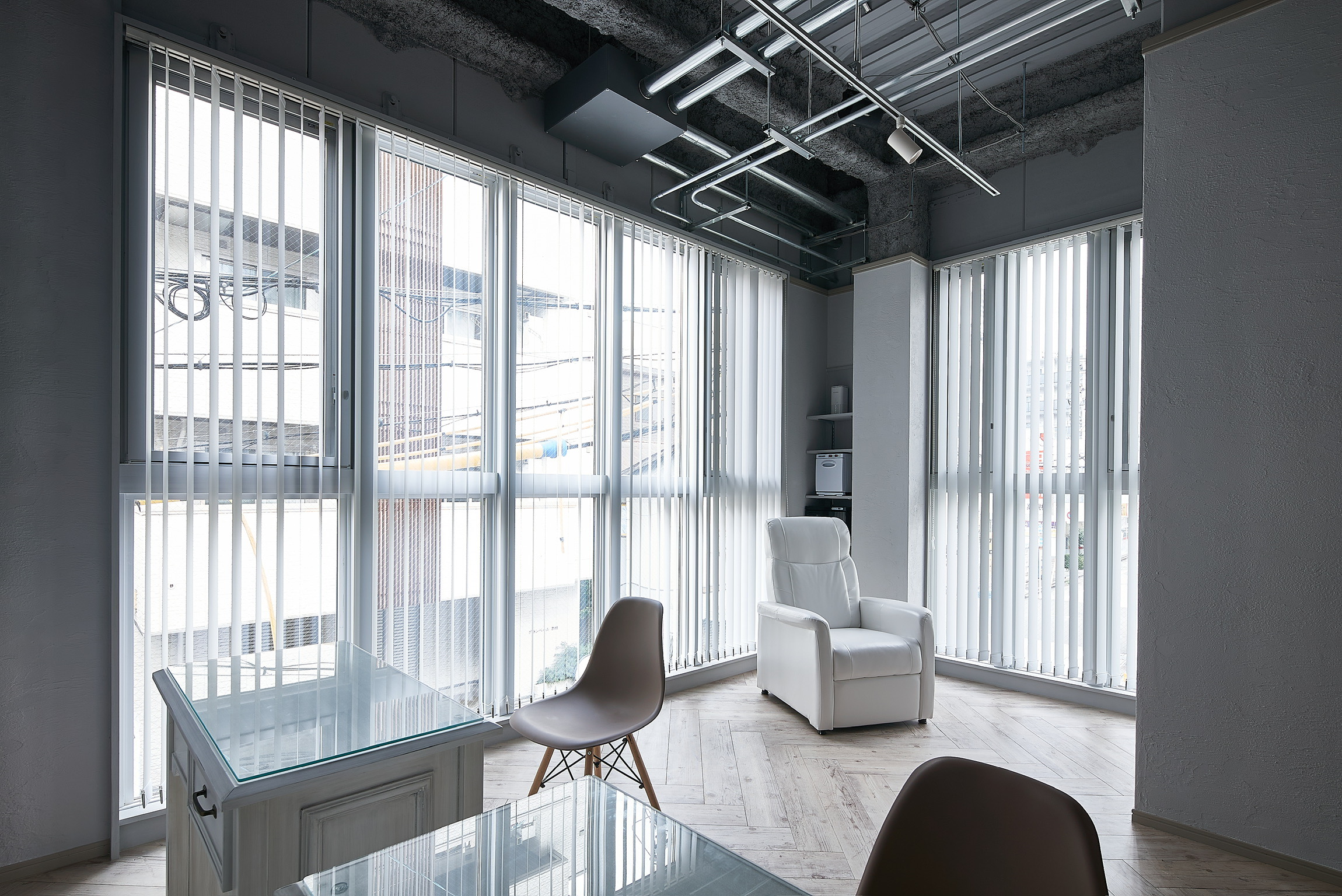 大きな連窓には縦型ブラインドを合わせて、自然光をやさしくコントロール。施術席ごとの明るさや動線も使いやすく調整しています。