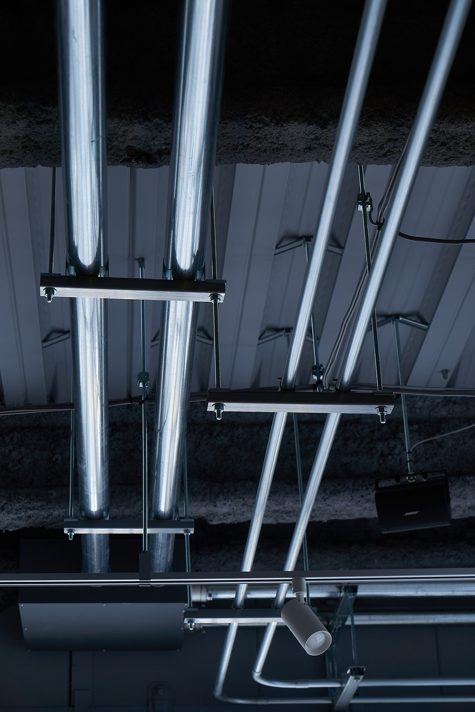 天井は躯体あらわしで、配管や照明レールをスッキリ整理しました。